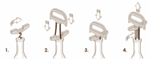 Работа с The Durand состоит из трех этапов. Сначала спиральная часть ввинчивается до упора, чтобы надежно зафиксировать пробку. Затем по бокам аккуратно вводятся два тонких лезвия, которые поднимают и защищают пробку от повреждений. После этого пробка извлекается легкими возвратно-поворотными движениями, оставаясь целой и без крошек. Такой способ минимизирует риск повредить пробку и, соответственно, испортить вино.
